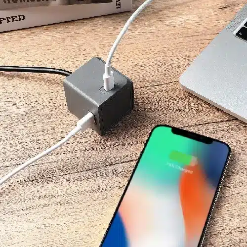 Het slimme en ruimtebesparende kubusontwerp voorkomt rommelige kabels en maakt deze lader perfect voor thuis, op kantoor en onderweg.